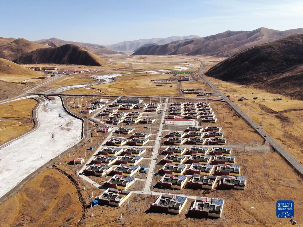 這是1月11日拍攝的青海省果洛藏族自治州甘德縣上貢麻鄉(xiāng)隆亞村搬遷點(diǎn)全貌(無(wú)人機(jī)照片)。新華社記者 張龍 攝