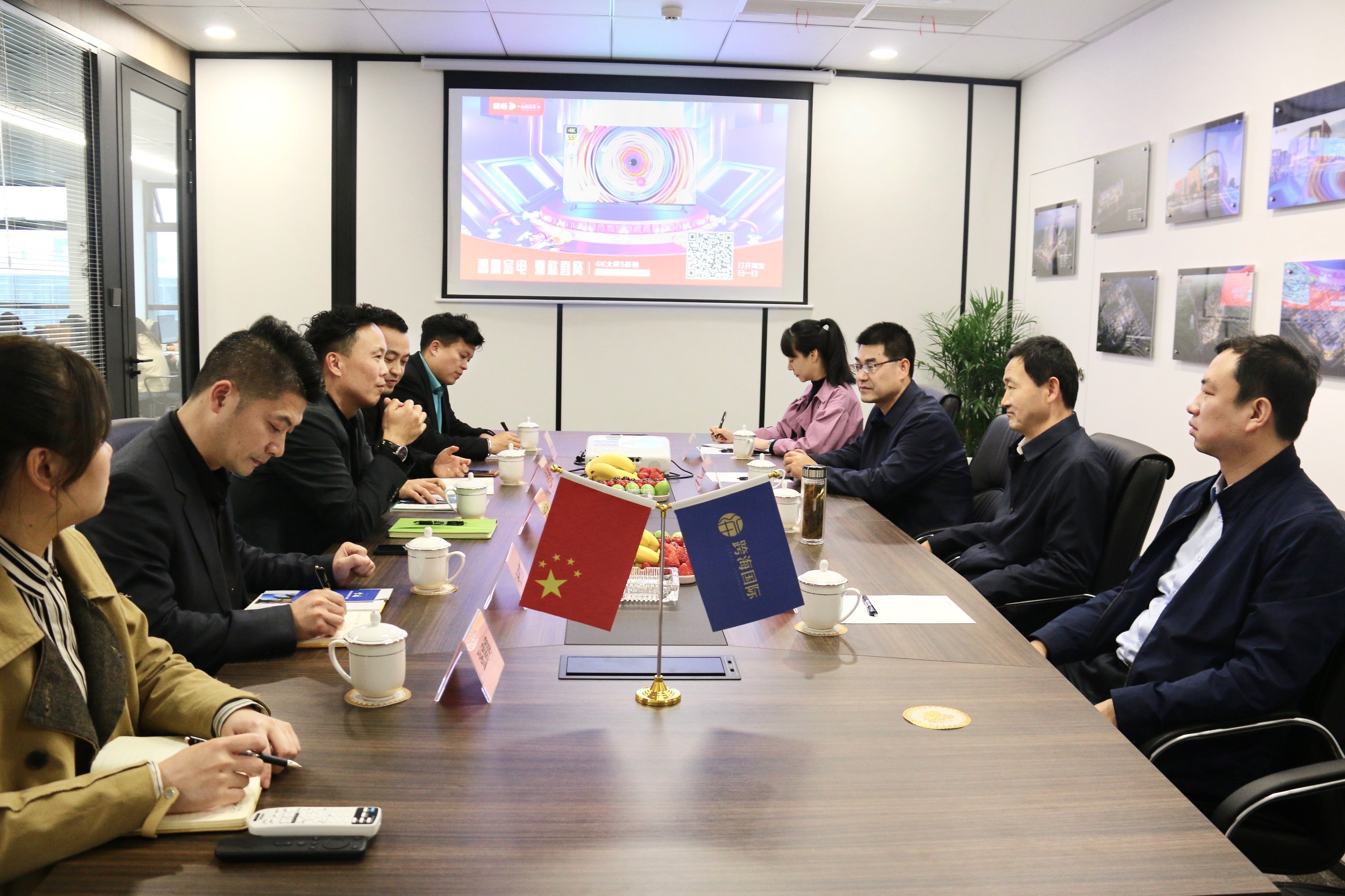 4月13日,陜西省寶雞市金臺區(qū)區(qū)委書記寧懷彬攜招商局、管委會等領(lǐng)導一行,蒞臨浙江跨??毓杉瘓F杭州總部考察指導工作。集團董事長林在安、執(zhí)行總裁張慶都及公司全體員工對考察團的到來致以誠摯的歡迎,并全程陪同考察。