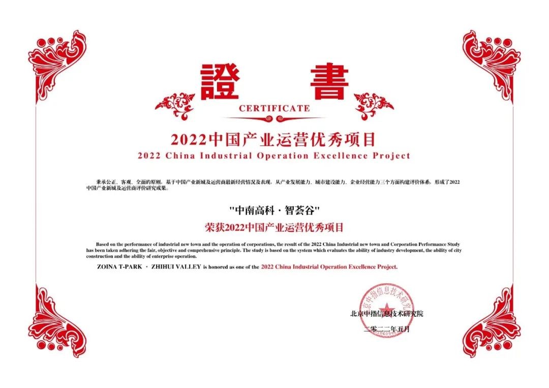 2022年5月20日,由中國企業(yè)評價協(xié)會、清華大學(xué)房地產(chǎn)研究所、中指研究院主辦的“2022中國房地產(chǎn)上市公司研究成果發(fā)布會暨第二十屆產(chǎn)城融合投融資大會”隆重舉行。中南高科憑借強(qiáng)大的綜合實(shí)力及良好的口碑,榮獲“2022中國產(chǎn)業(yè)園區(qū)運(yùn)營商綜合實(shí)力TOP10”榮譽(yù),這也是中南高科連續(xù)兩年獲此殊榮。中南高科智薈谷榮獲“2022中國產(chǎn)業(yè)運(yùn)營優(yōu)秀項目”稱號。